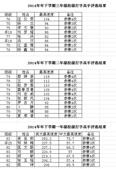 为了进一步提高我校学生学习计算机课程的积极性和计算机操作水平,学校于上学期每月组织了打字高手比赛,于期末评选出了校级打字高手。