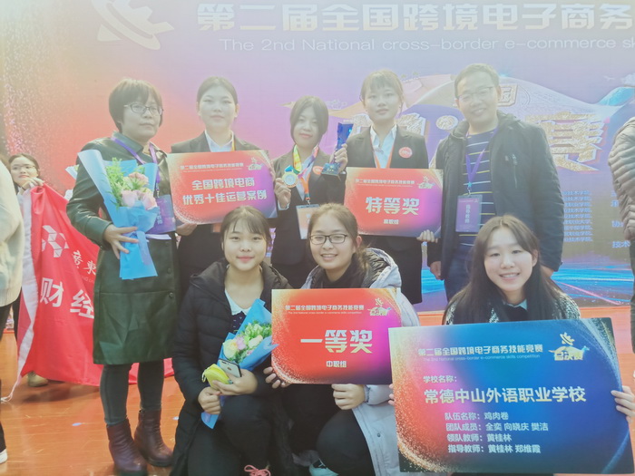 第二届全国跨境电子商务技能竞赛分为院校选拔赛与全国总决赛两个赛段,6月4日-10日,全国132所院校的7638名学生报名参加选拔赛,经过前期院校选拔赛的遴选,共有114所院校晋级全国总决赛,常德中山外语职业学校的高职组和中职组双双晋级。晋级院校团队进入总决赛赛段,分别进行“实战运营”和“现场决策”两大模块的比拼,其中“实战运营”模块为线上运营,使用技术支持单位奥派股份定制研发的“跨境电子商务运营实战平台”,围绕跨境电商选品、网站设计、营销推广、等核心运营环节进行了长达两个月的实战运营,在运营期的阶段考核成绩都纳入决赛成绩,常德中山外校在运营阶段经过两名指导老师(黄桂林老师、郑维霞老师)及6名同学(高职组:吴亚莉、艾思、夏婷;中职组:全奕、樊洁、向晓庆)的共同努力,取得了高职组第六名、中职组第四名的阶段性好成绩。“现场决策”模块于12月1日上午进行,晋级队伍使用“跨境电子商务理论考核系统”,进行1个小时的上机比试,考查团队对跨境电商热点知识的关注程度及在跨境电商实战中决策分析的能力。经过最后的比拼,常德中山外语职业学校高职组荣获特等奖,中职组荣获一等奖,实现双丰收,取得了历史性的好成绩。