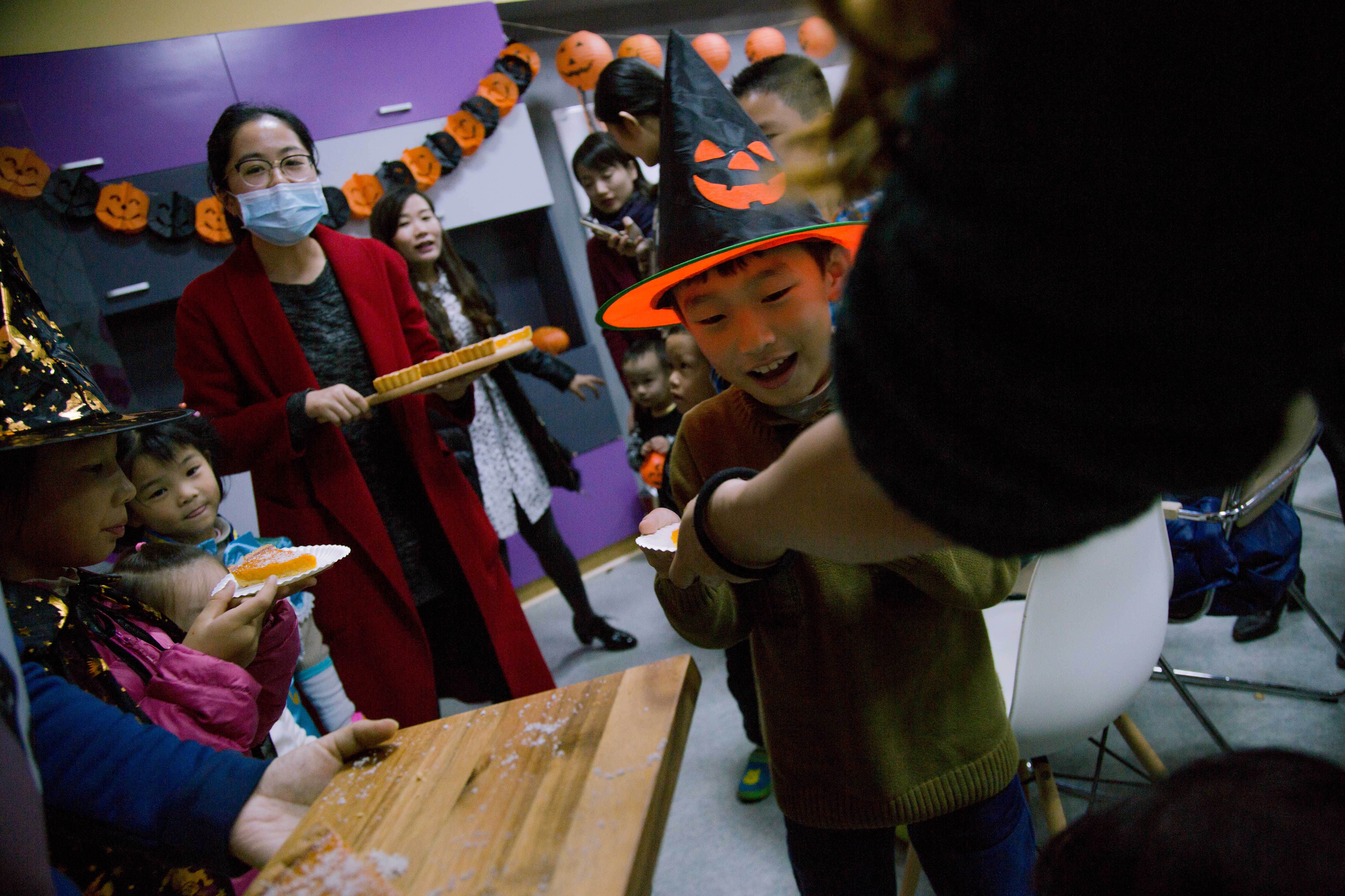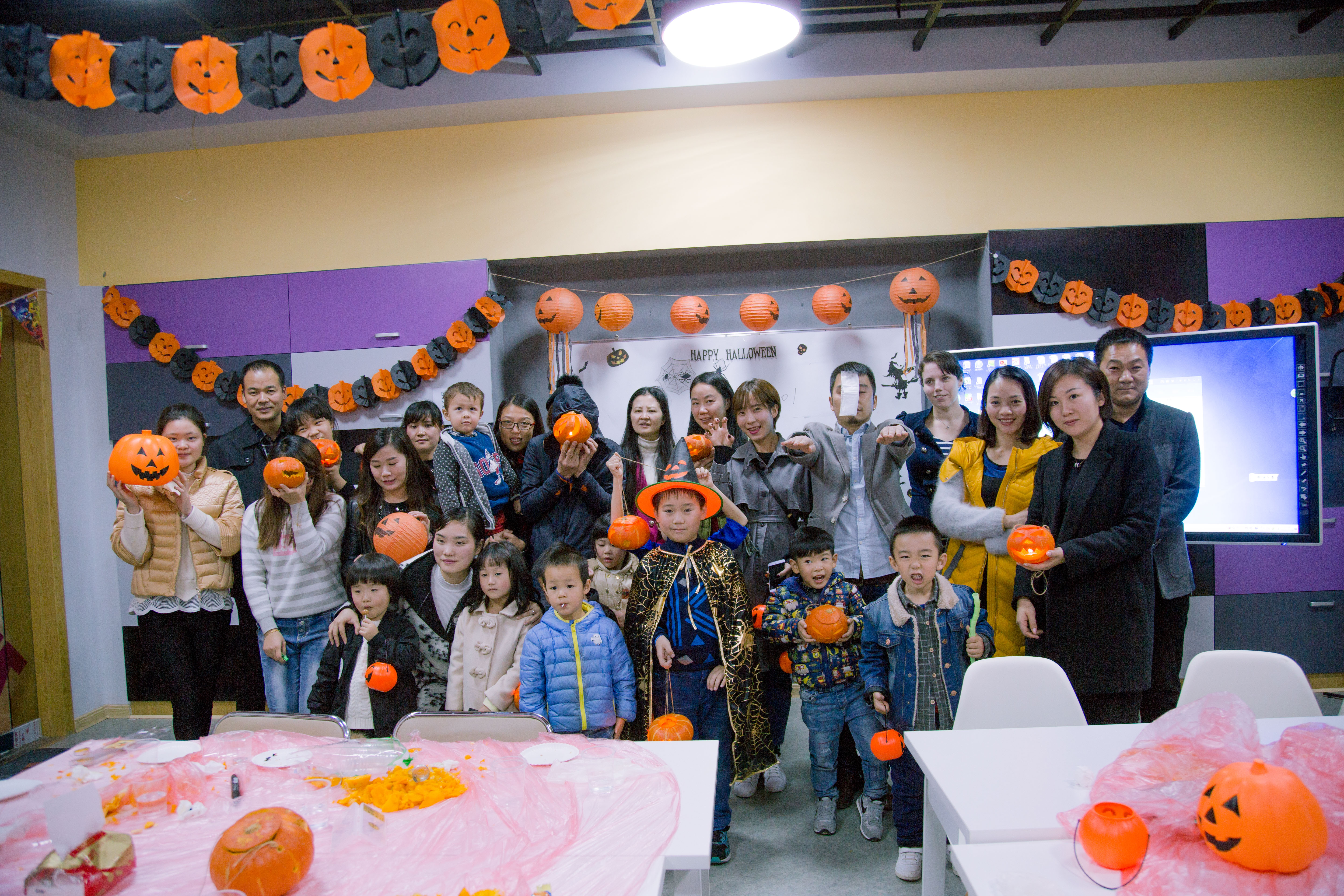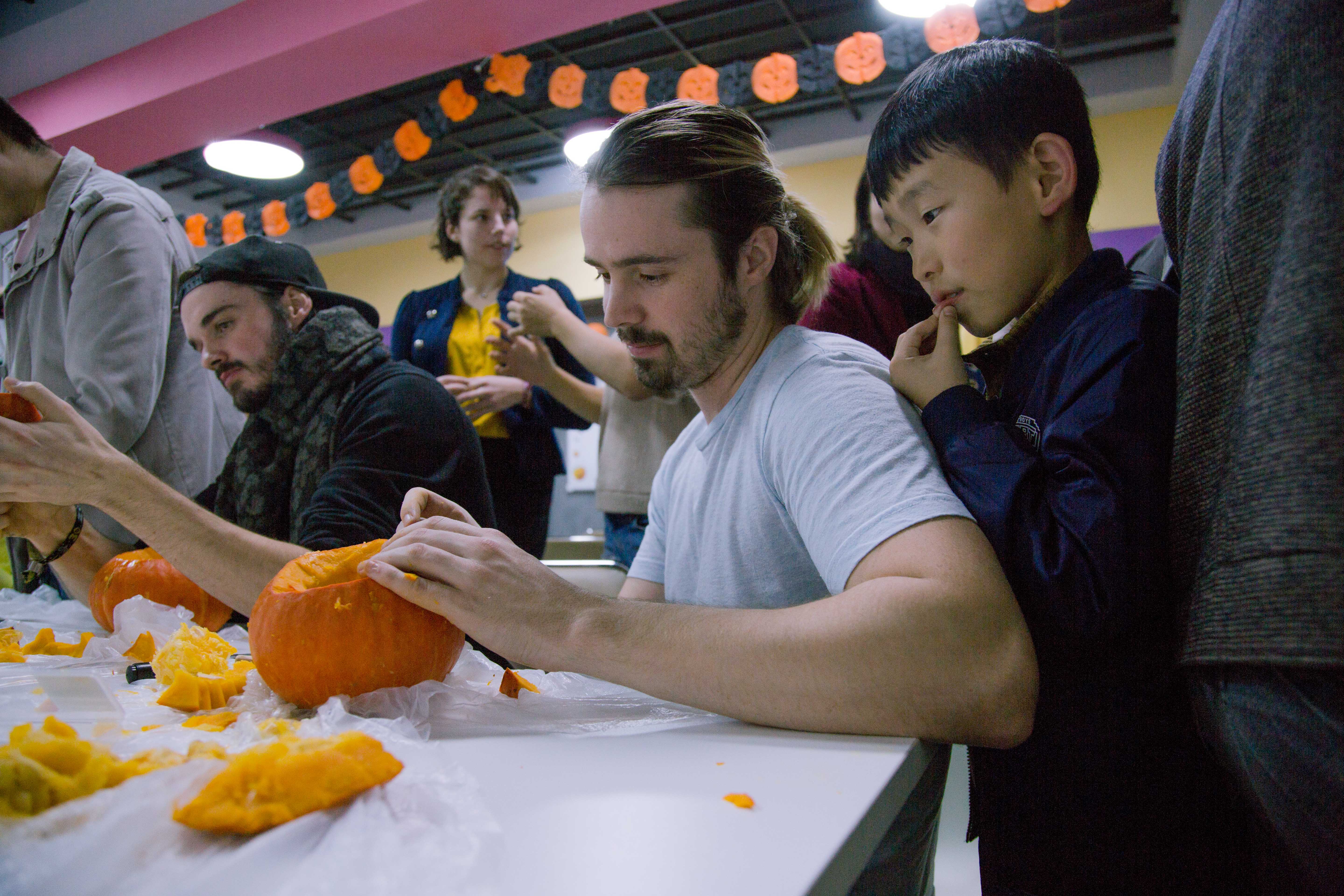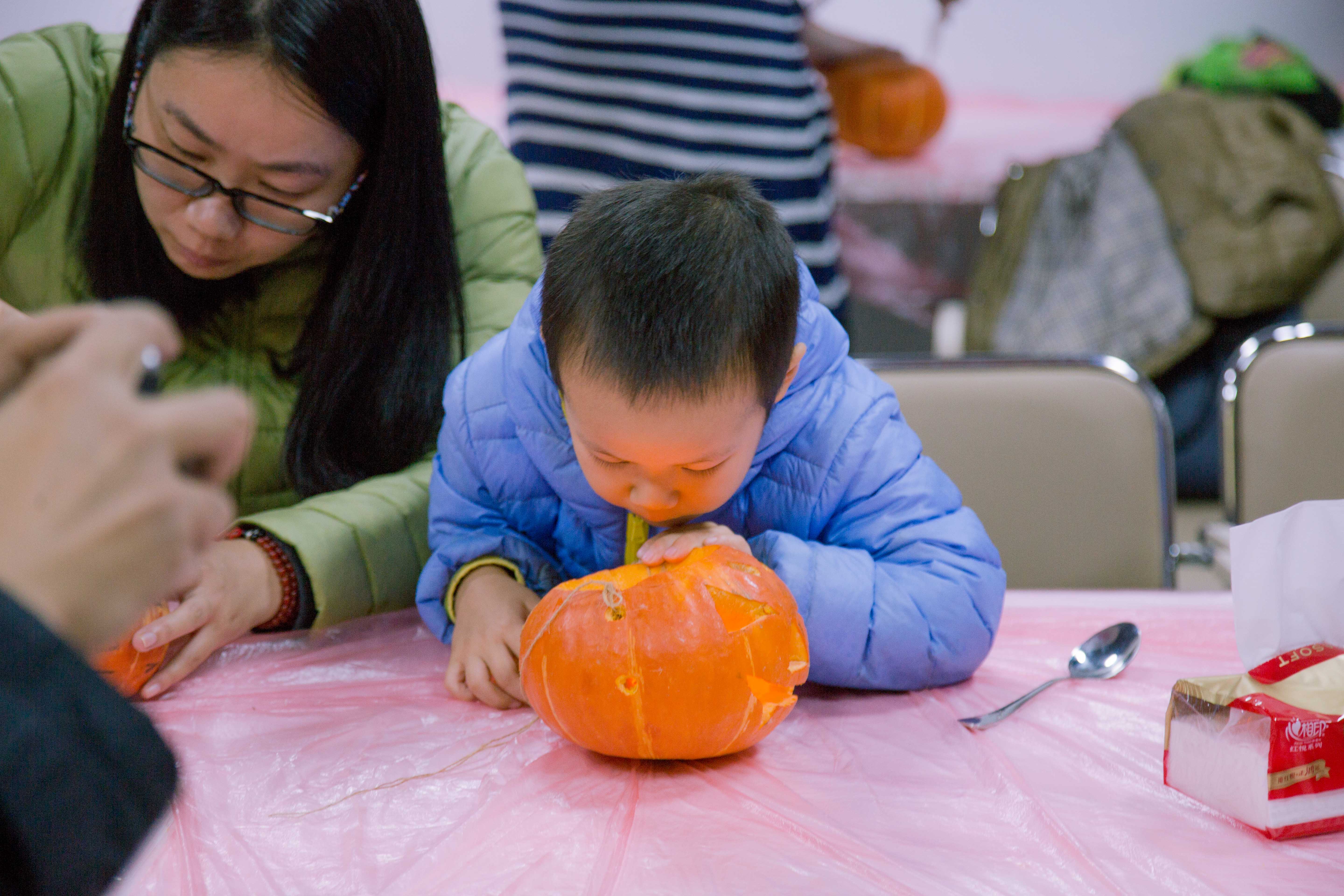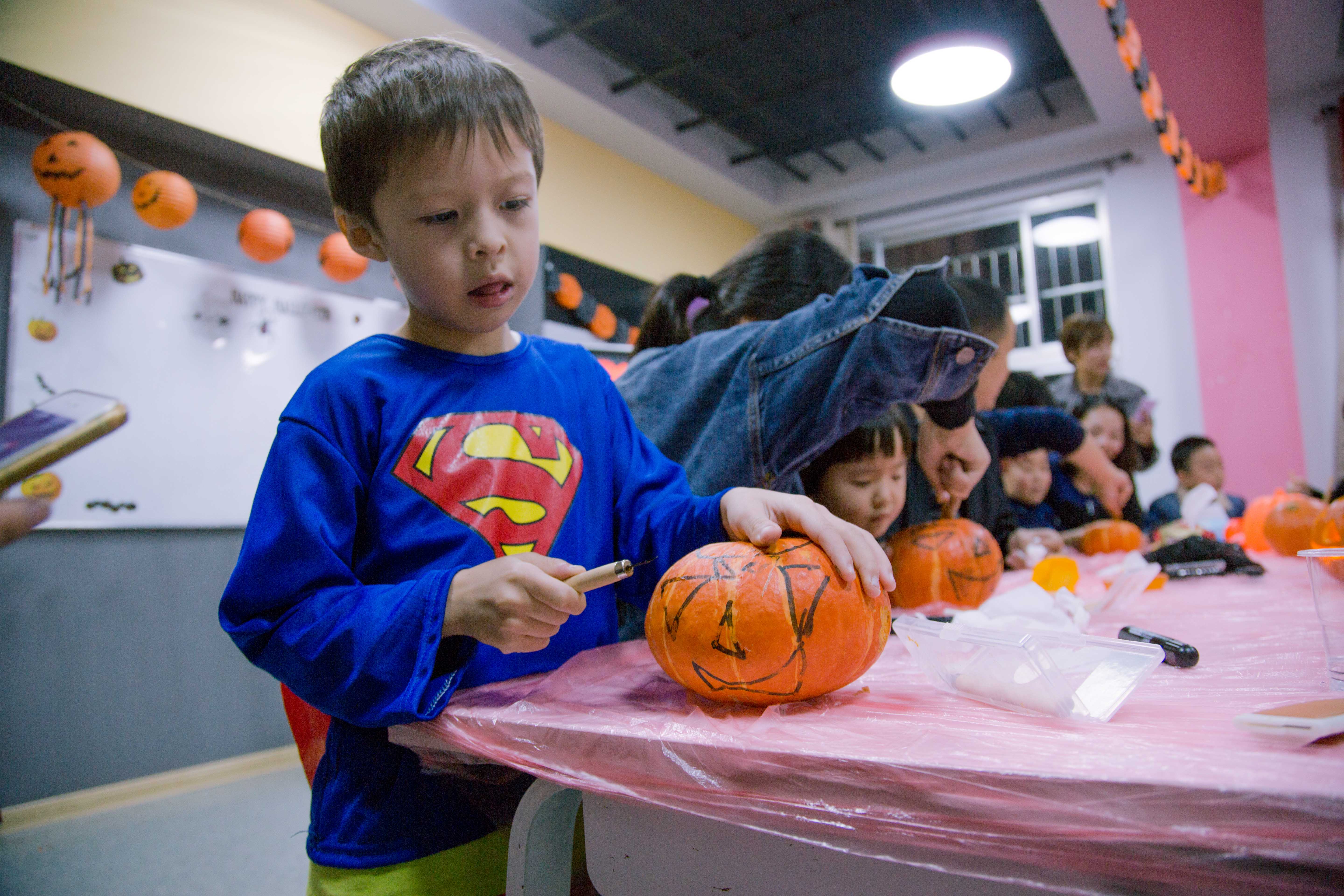 Step1.家长和小朋友共同制作万圣节南瓜灯(Jack-o-lanterns),在妈妈的陪同下,小朋友也特别认真哟~