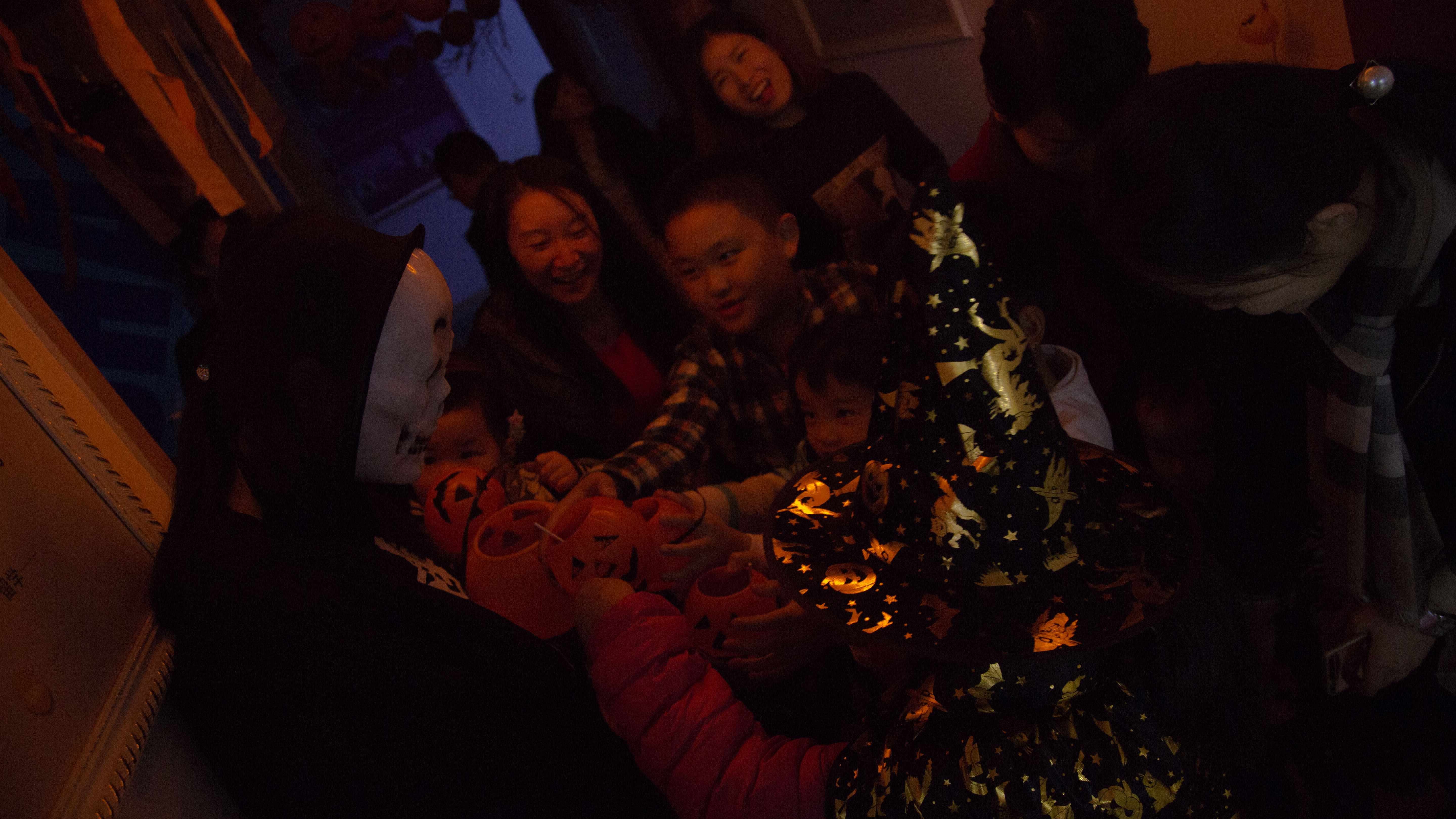 打开魔鬼的大门,说出通关密语,开启寻糖之旅。每一位小朋友都特别的勇敢,说出通关密语之后小小南瓜桶里面就装满了糖果哟~