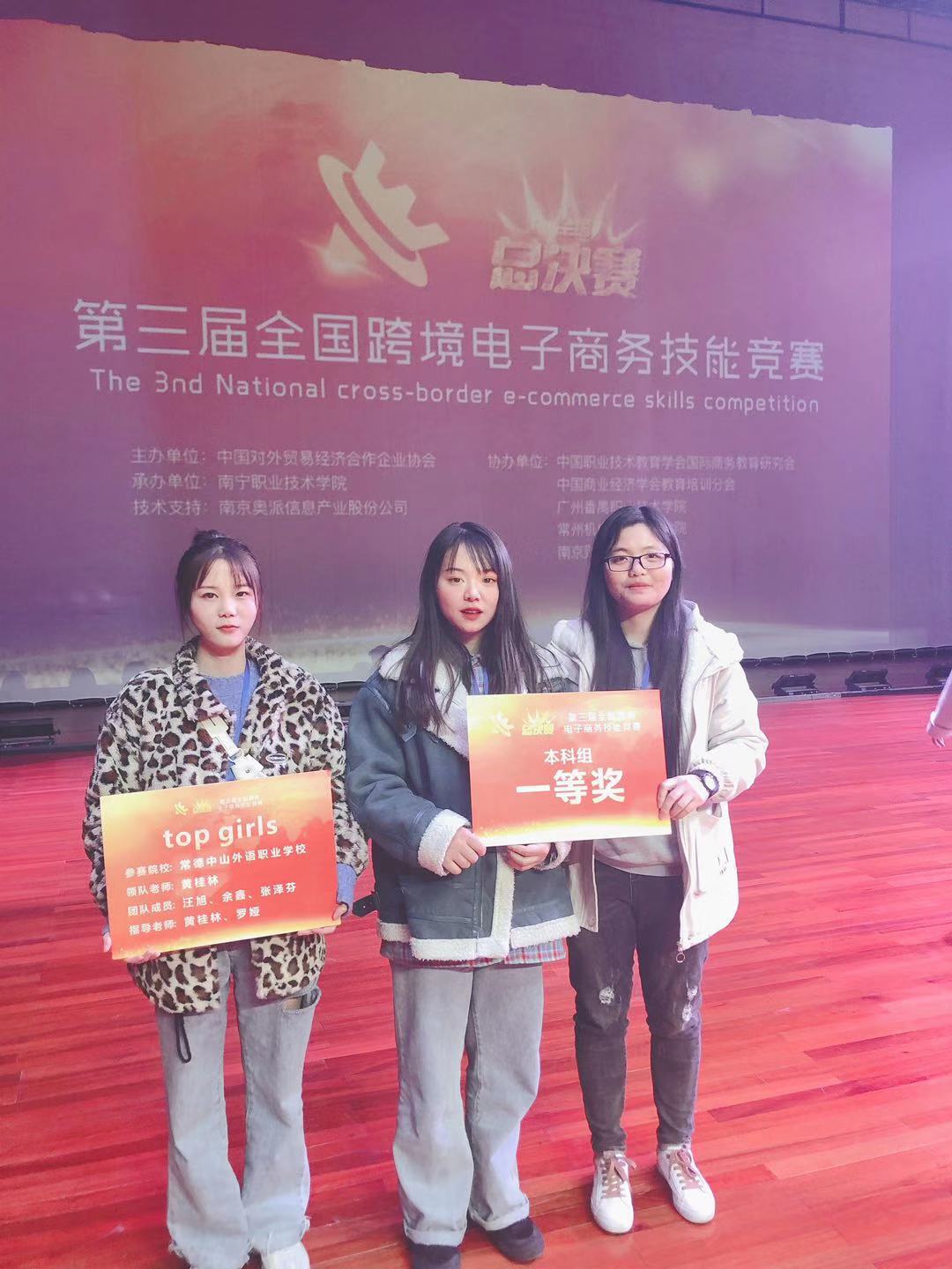 常德中山外语职业学校派出了三支代表队,分别参与本科组、高职组和中职组的决战。经过校园选拔赛、实战运营及现场沙盘模拟三个环节的比拼,汪旭、余鑫、张泽芬组成的topgirls队获本科组总决赛一等奖;郭婧婧、王璐和严若静组成的Superego队获高职组总决赛二等奖;曾琪、李乐和孙孟杰组成的夹心饼干队获中职组总决赛一等奖。