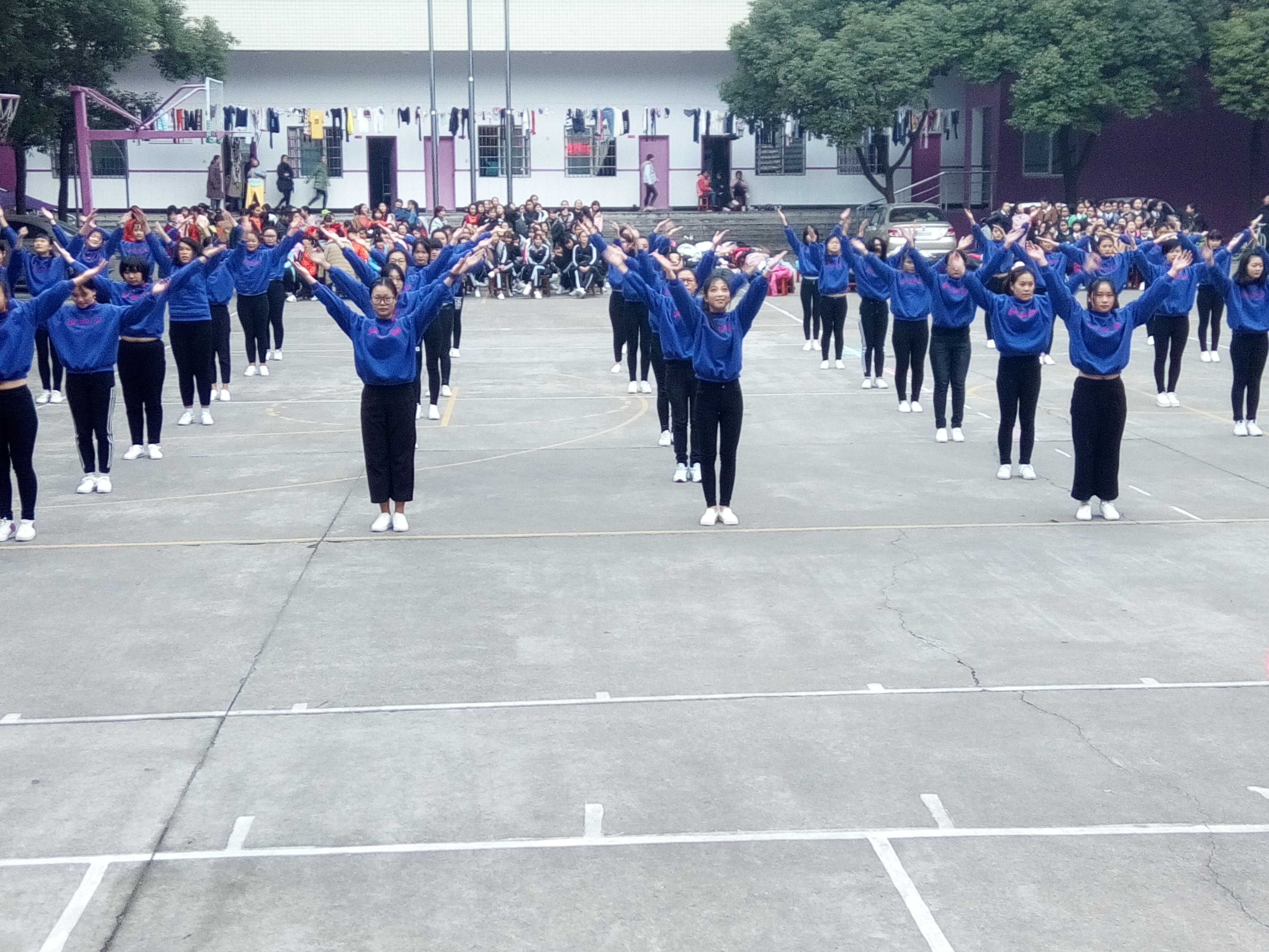 2、队列:指挥员(体育委员或选派的学生)整队、看齐、报数,学生报数完毕后,指挥员要向裁判长报告人数,然后成广播体操队形散开进行体操表演。