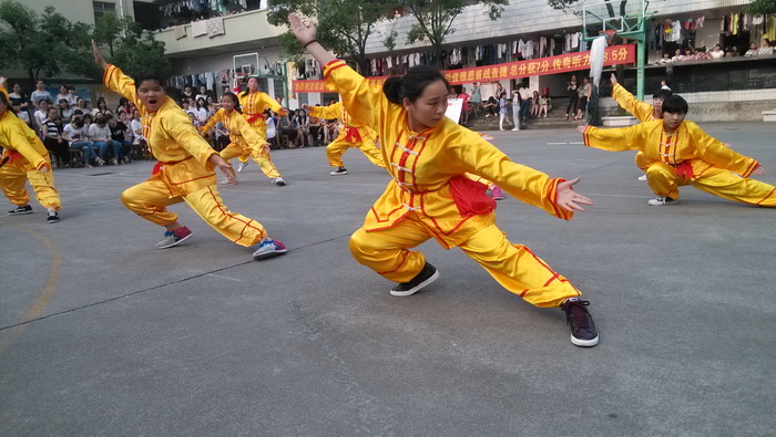 汇报表演在校我微电影《梦想在路上》主题曲《我还记得》的演唱者 徐晶、蔡静雯、曾黎同学那感受成功、饱含感恩和充满期待的歌声中拉开了序幕。紧接着担任2015全国贺龙杯业余篮球赛 常德赛区第二次联赛啦啦宝贝的我校啦啦队表演了活泼、动美的啦啦操,全场掌声雷动,观众眼前一亮。接下来的《民族舞》令人回味无穷;文学社的诗朗诵《成长如歌》情感丰富,观众眼前一亮。武术社表演的《中华有神功》手中双节棍来去自如,给观众带来一波波强烈视觉冲击;《爵士舞》将舞者的精神展现得淋漓尽致…… 整个节目编排新颖,形式多样,精彩缤纷,亮点频频,令人耳目一新。18点28分本届汇报演出在歌声、欢笑与惊喜的氛围中圆满结束。