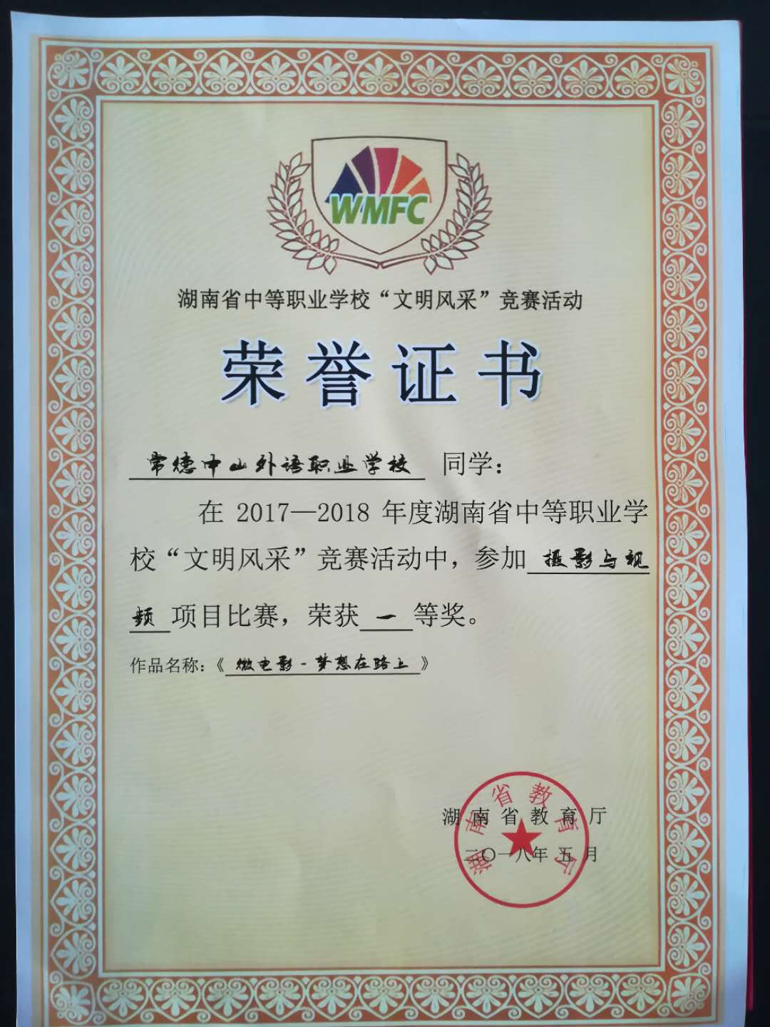 根据常德市教育局《关于组织2018年常德市中等职业学校“文明风采”竞赛活动的通知》(常教通〔2017〕191号)精神,全市开展了以“文明风采伴我行,成就出彩人生梦”为主题的中等职业学校“文明风采”竞赛活动。活动分为三大类:一、演讲征文类;二、职业规划与创新设计类;三、摄影与视频类;我校响应号召、精心组织,由左菲校长指导,广大师生积极参与,作品微电影——梦想在路上,在“摄影与视频类”项目中,荣获一等奖;学校荣获2018年常德市中等职业学校“文明风采”竞赛优秀团体组织。湖南省教育厅给我校颁发了荣誉证书,以资鼓励。